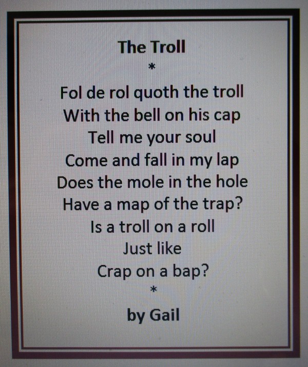 The Troll * Fol de rol quoth the troll with the bell on his cap Tell me your soul, come and fall in my lap Does the mole in the hole have a map of the trap?… Is a troll on a roll just like crap on a bap? * by Gail Share this: Click to share on X (Opens in new window) X Click to share on Facebook (Opens in new window) Facebook Like Loading...