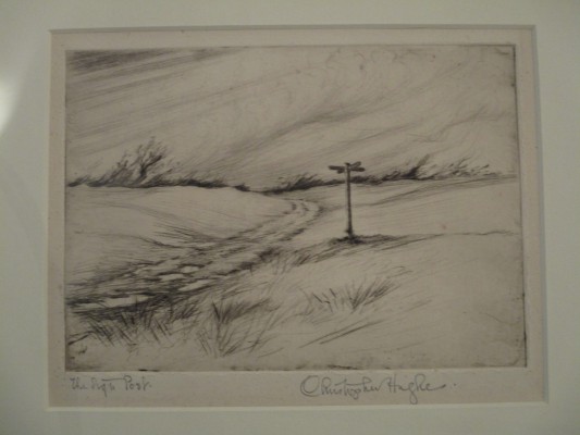 For those of us who respond to art instinctively and emotionally rather than with an academic eye it is our immediate response to a work that matters. The curator and I both particularly enjoyed ‘The Duke’s Vaunt’, a pen and watercolour view by John Stone, a little known artist, of an ancient tree in Savernake Forest that at one point could embrace within its trunk twenty school boys and a small musical band; and ‘The Sign-post’, an 1930 etching by a former Art Master at Marlborough College that delicately depicts a lonely crossroads somewhere on the Plain.